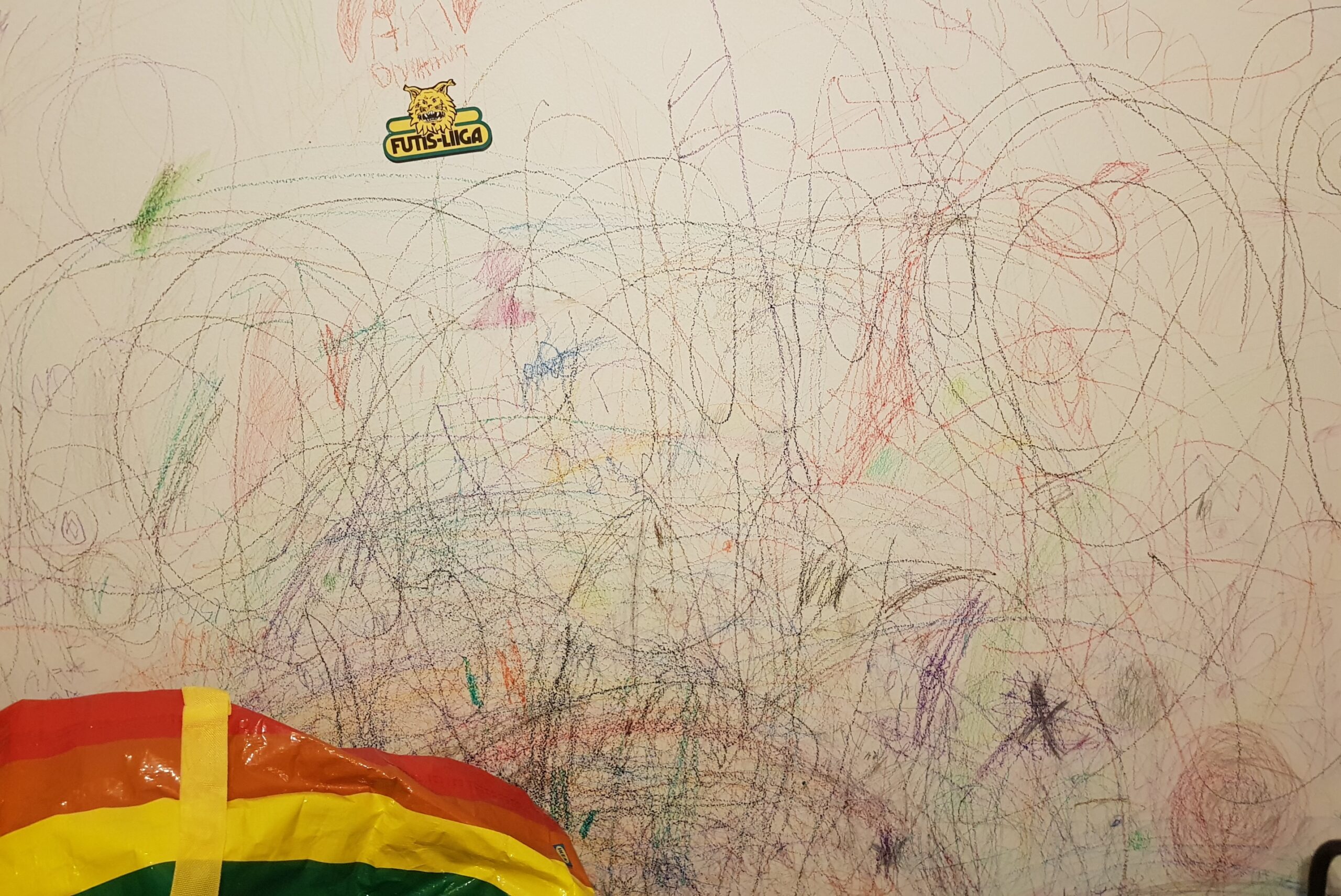 Hän nukahtaa pehmokissa kädessään. Kissa on saanut nimeksi Onni. Tärkeän ihmisen mukaan. Vielä vuosi sitten hän ennen nukahtamistaan piirteli sängyn vierellä olevaan seinään vahaväreillä, kunnes silmä alkoi painaa unimaahan. Olin antanut luvan, sillä lapsesta ei saa torpata luovuutta. Se on vain seinä.